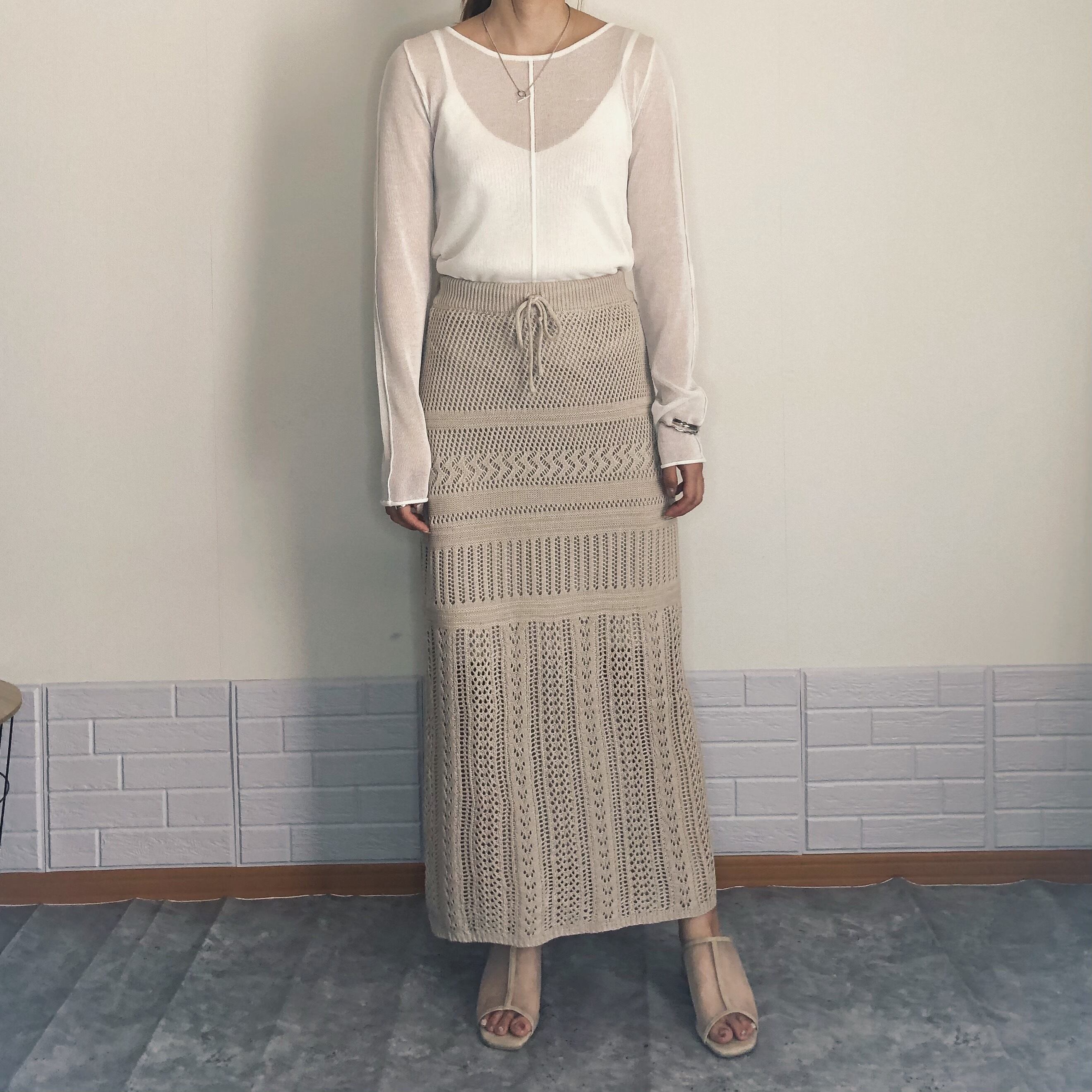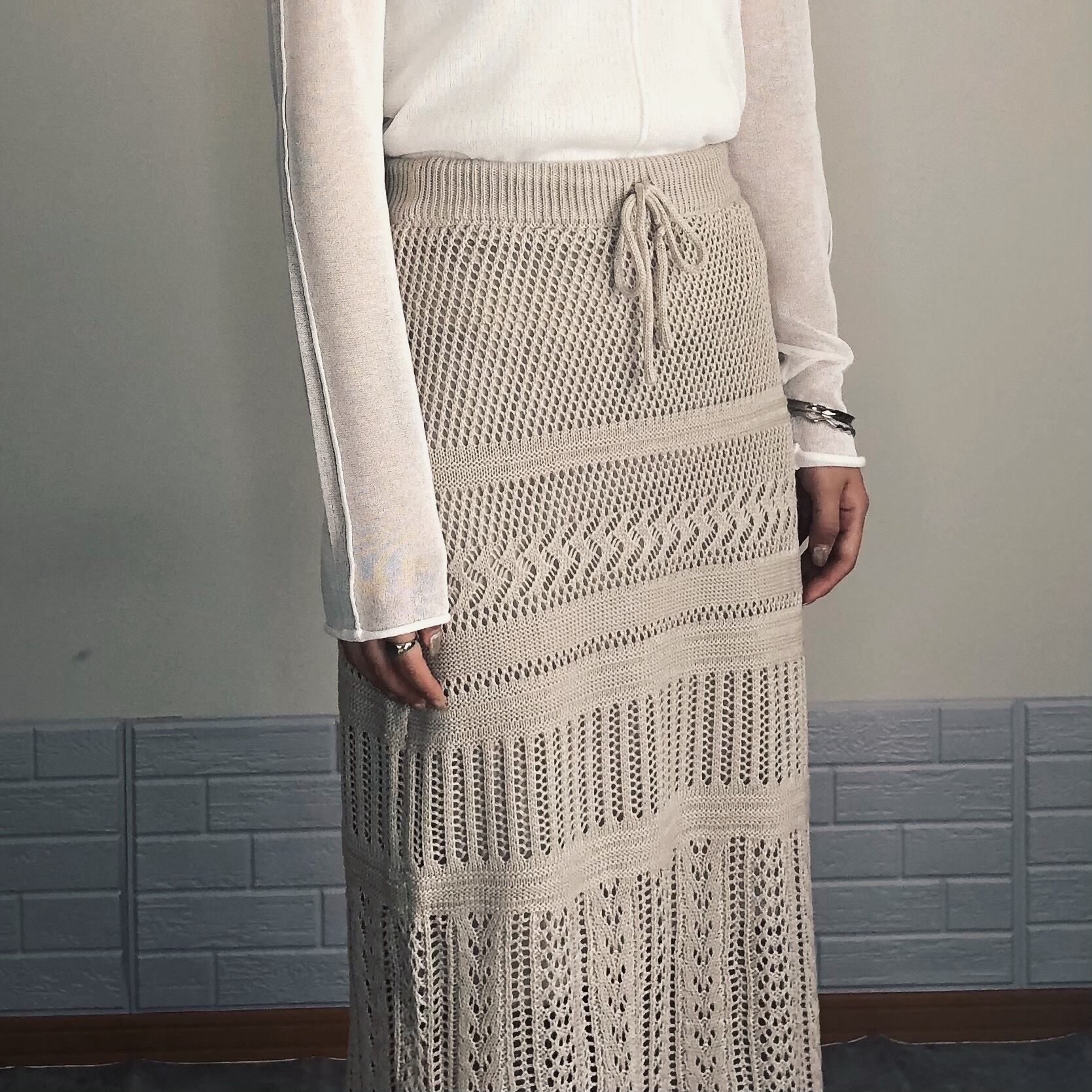 様々な柄の透かし編みを組み合わせた、繊細な編地が女性らしさ溢れるニットスカート。程よくタイトなラインが、合わせるトップスを選ばない優秀スカート。コットン混の素材なので、夏場まで長く使える一着。長めの着丈で、大人の女性が履きやすいスカートです。